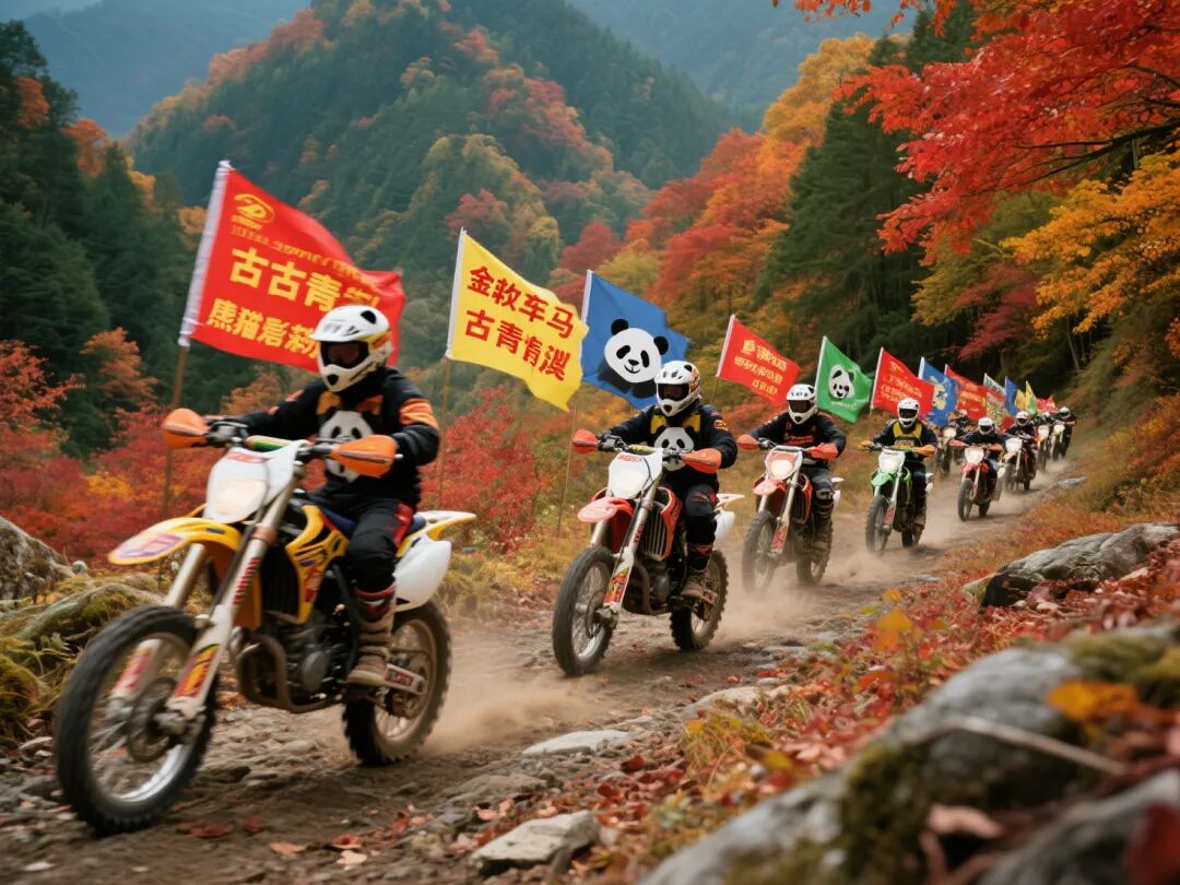 活动内容:18辆装饰着“金戈铁马古青溪 熊猫彩林唐家河”彩旗的山地越野摩托车,穿梭在唐家河旅游区青山红叶间。